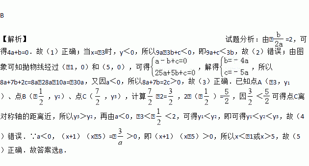 B 【解析】试题分析:由﹣=2,可得4a+b=0.故(1)正确;当x=﹣3时,y<0,所以9a﹣3b+c<0,即9a+c<3b,故(2)错误;由图象可知抛物线经过(﹣1,0)和(5,0),可得,解得,所以8a+7b+2c=8a﹣28a﹣10a=﹣30a,又因a<0,所以8a+7b=2c>0,故(3)正确.已知点A(﹣3,y1)、点B(﹣,y2)、点C(,y3),计算﹣2=,2﹣(﹣)=,因<...如图,将△ABC绕着点C按顺时针方向旋转20°,B点落在B′位置,A点落在A′位置,若AC⊥A′B′,则∠BAC的度数是( )