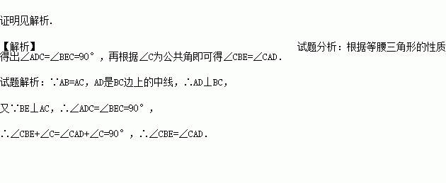 在△ABC 中,AB=AC,AD是BC边上的中线,BE⊥AC于点E.求证:∠CBE=∠CAD.
