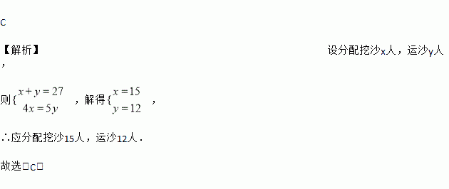 某工程队共有27人,每天每人可挖土4方,或运土5方,为使挖出的土及时运走,应分配挖土和运土的人分别是( )