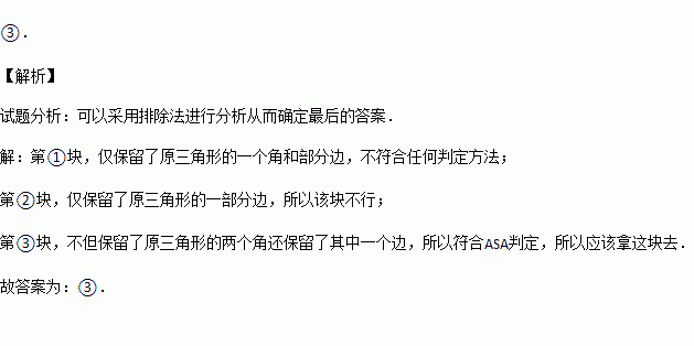 小明家有一块三角形的玻璃不小心打破了如图所示,现在要带其中一块碎片去玻璃店配一块和原来形状、大小一样的玻璃,应该带 .(填序号①、②、③)