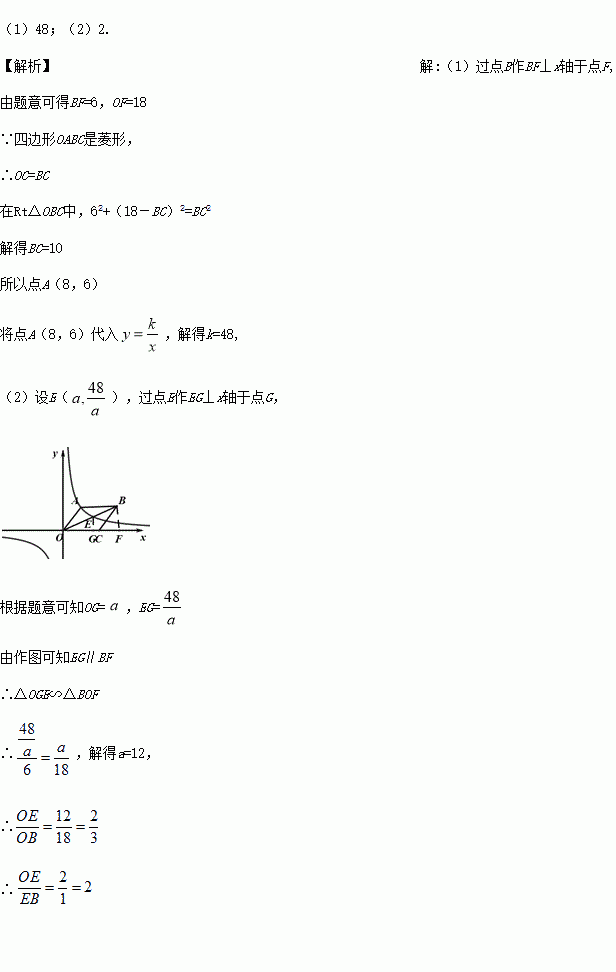 如图,已知四边形OABC是菱形,OC在x轴上,B(18,6),反比例函数y= (k≠0)的图象经过点A,与OB交于点E.