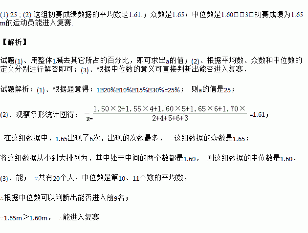 (Ⅲ)根据这组初赛成绩,由高到低确定9人进入复赛,请直接写出初赛成绩为1.65m的运动员能否进入复赛.