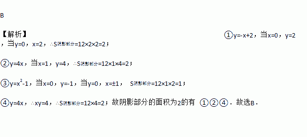 B 【解析】①y=-x+2,当x=0,y=2,当y=0,x=2,∴S阴影部分=12×2×2=2; ②y=4x,当x=1,y=4,∴S阴影部分=12×1×4=2; ③y=x2-1,当x=0,y=-1,当y=0,x=±1, S阴影部分=12×1×2=1; ④y=4x,∴xy=4,∴S阴影部分=12×4=2;故阴影部分的面积为2的有 ①②④.故选B.
