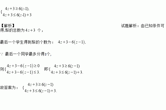 把一筐梨分给几个学生,若每人4个,则剩下3个;若每人6个,则最后一个同学最多分得3个,求学生人数和梨的个数.设有z个学生,依题意可列不等式组为__________.