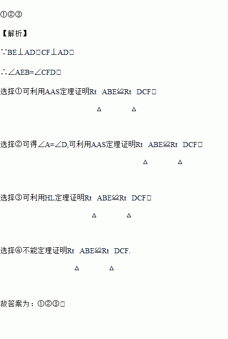 如图所示,已知BE⊥AD,CF⊥AD,垂足分别为E,F,则在下列条件中选择一组,可以判定 R t△ABE≌ R t△DCF的是____________(填入序号)