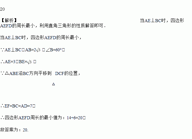 ,∠B=60°.E是边BC上任意一点,沿AE剪开,将△ABE沿BC方向平移到△DCF的位置,得到四边形AEFD,则四边形AEFD周长的最小值为_____.