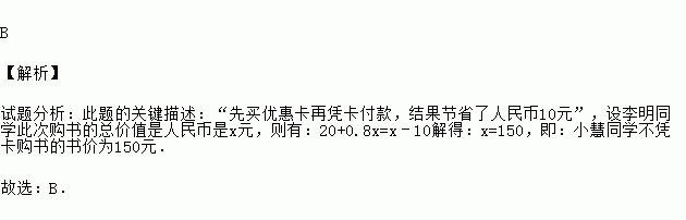 为配合荆州市“我读书,我快乐”读书节活动,某书店推出一种优惠卡,每张卡售价20元,凭卡购书可享受8折优惠,小慧同学到该书店购书,她先买优惠卡再凭卡付款,结果节省了10元.若此次小慧同学不买卡直接购书,则她需付款多少元?( )