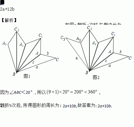 在△ABC中,∠ABC<20°,三边长分别为a,b,c,将△ABC沿直线BA翻折,得到△ABC1;然后将△ABC1沿直线BC1翻折,得到△A1BC1;再将△A1BC1沿直线A1B翻折,得到△A1BC2;…,若翻折4次后,得到图形A2BCAC1A1C2的周长为a+c+5b,则翻折11次后,所得图形的周长为_____________.(结果用含有a,b,c的式子表示)