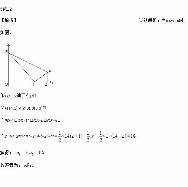 如图,由点P(14,1),A(a,0),B(0,a)(0<a<14)确定的△PAB的面积为18,则a的值为_____.