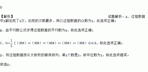 A. 众数是3 B. 平均数是4 C. 方差是1.6 D. 中位数是6
