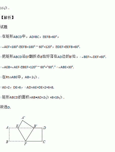 如图,把矩形ABCD沿EF翻转,点B恰好落在AD边的B′处,若AE=2,DE=6,∠EFB=60°,则矩形ABCD的面积是