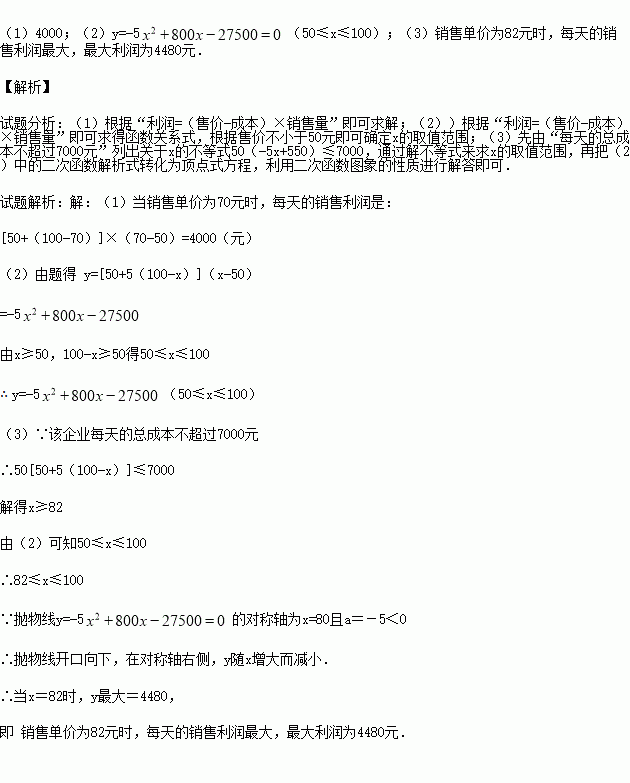 (3)如果该企业每天的总成本不超过7000元,那么销售单价为多少元时,每天的销售利润最大?最大利润是多少?(每天的总成本=每件的成本×每天的销售量)