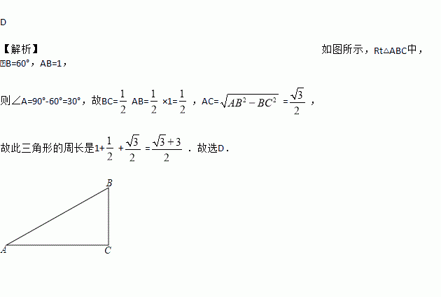已知直角三角形一个锐角60°,斜边长为1,那么此直角三角形的周长是( )