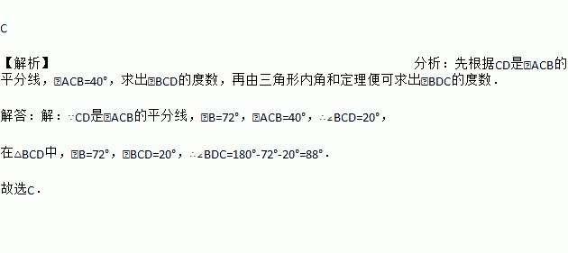 C 【解析】分析:先根据CD是∠ACB的平分线,∠ACB=40°,求出∠BCD的度数,再由三角形内角和定理便可求出∠BDC的度数. 解答:【解析】 ∵CD是∠ACB的平分线,∠B=72°,∠ACB=40°,∴∠BCD=20°, 在△BCD中,∠B=72°,∠BCD=20°,∴∠BDC=180°-72°-20°=88°. 故选C.