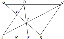 于是得到结论,②若DG=DP,设DG=DP=3m,则PB=3m,PE=BE=PF=2m,AB=AD=2DG=6m,AF=4m,BF=5m,设AH=x,求得FH=$\sqrt{(4m)2-x2}$=$\frac{5\sqrt{7}}{4}$m,得到tan∠DAB=$\frac{FH}{AH}$=$\frac{5\sqrt{7}}{9}$.