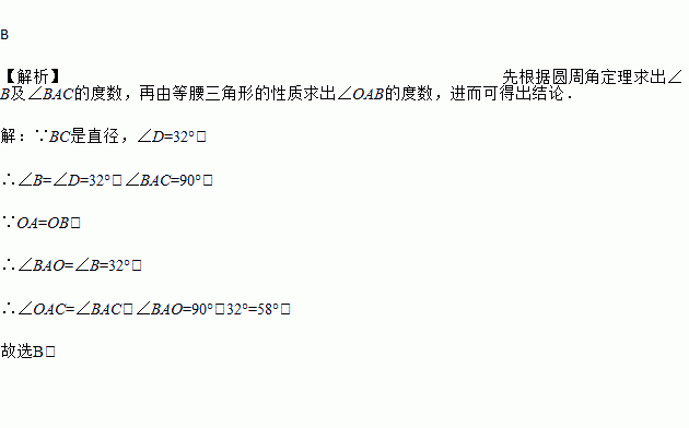 如图,A、D是⊙O上的两个点,BC是直径.若∠D=32°,则∠OAC=( )