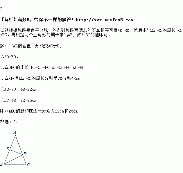 已知△ABC中,AB=AC,AB的垂直平分线交AC于D,△ABC和△DBC的周长分别是70cm和48cm,则△ABC的腰和底边长分别为( )