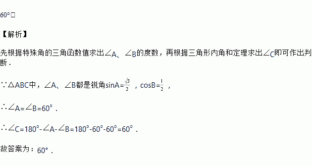 在△ABC中,∠A,∠B都是锐角,若sinA=,cosB=,则∠C= .