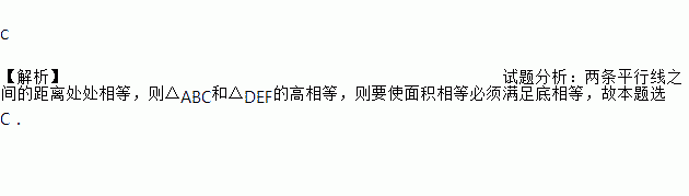 C 【解析】试题分析:两条平行线之间的距离处处相等,则△ABC和△DEF的高相等,则要使面积相等必须满足底相等,故本题选C.