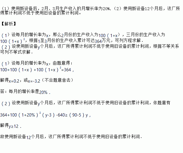 某工厂使用旧设备生产,每月生产收入是90万元,每月另需要支付设备维护费5万元.从今年1月份起使用新设备,生产收入增长且无设备维护费,使用当月生产收入达100万元,1至3月份生产收入以相同的百分率逐月增长,累计达364万元,3月份后,每月生产收入稳定在3月份的水平.