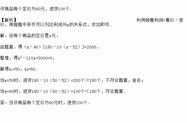 该商品每个定价为60元,进货100个. 【解析】利用销售利润=售价﹣进价,根据题中条件可以列出利润与x的关系式,求出即可. 【解析】 设每个商品的定价是x元, 由题意,得(x﹣40)[180﹣10(x﹣52)]=2000, 整理,得x2﹣110x+3000=0, 解得x1=50,x2=60. 当x=50时,进货180﹣10(50﹣52)=200个>180个,不...