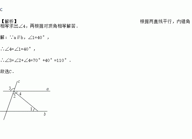 如图,直线a,b被直线c所截,若a∥b,∠1=40°,∠2=70°,则∠3=( )