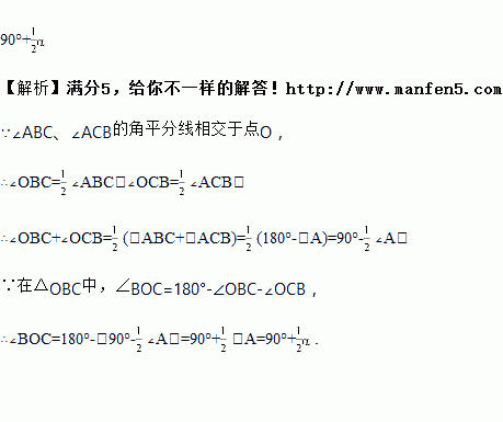 如图,在△ABC中,∠ABC,∠ACB的角平分线相交于O点。 如果∠A=α,那么∠BOC的度数为____________.