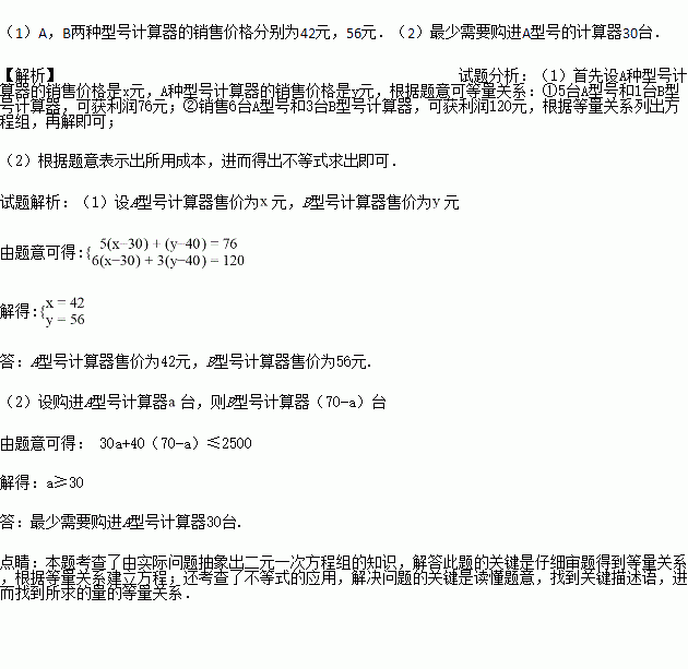 (2)商场准备用不多于2500元的资金购进A,B两种型号计算器共70台,问最少需要购进A型号的计算器多少台?