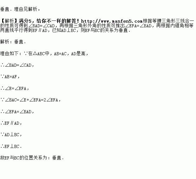 如图,在△ABC中,AB=AC,E在CA延长线上,AE=AF,AD是高,试判断EF与BC的位置关系,并说明理由.