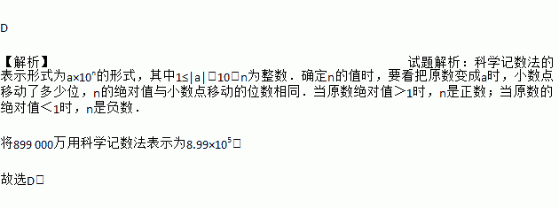 D 【解析】试题解析:科学记数法的表示形式为a×10n的形式,其中1≤|a|<10,n为整数.确定n的值时,要看把原数变成a时,小数点移动了多少位,n的绝对值与小数点移动的位数相同.当原数绝对值>1时,n是正数;当原数的绝对值<1时,n是负数. 将899 000万用科学记数法表示为8.99×105. 故选D.