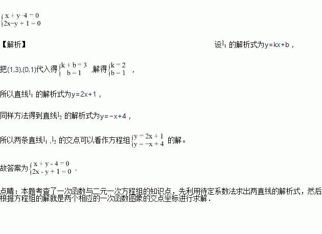 如下图中的两条直线,,则其交点可以看作方程组____________的解.