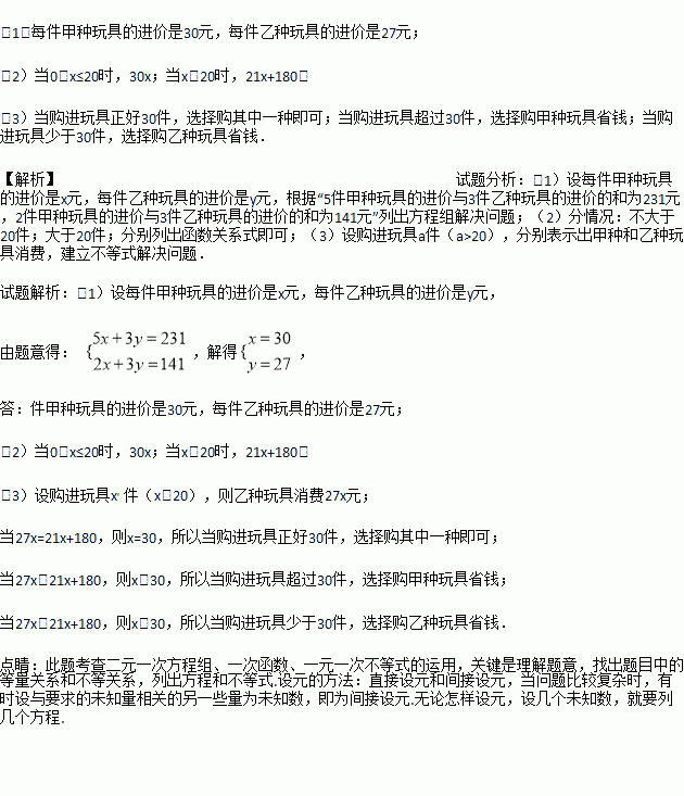 (3)在(2)的条件下,超市决定在甲、乙两种玩具中选购其中一种,且数量超过20件,请你帮助超市判断购进哪种玩具省钱.