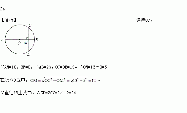 如图,在⊙O中,直径AB丄弦CD于点M,AM=18,BM=8,则CD的长为 ▲ .