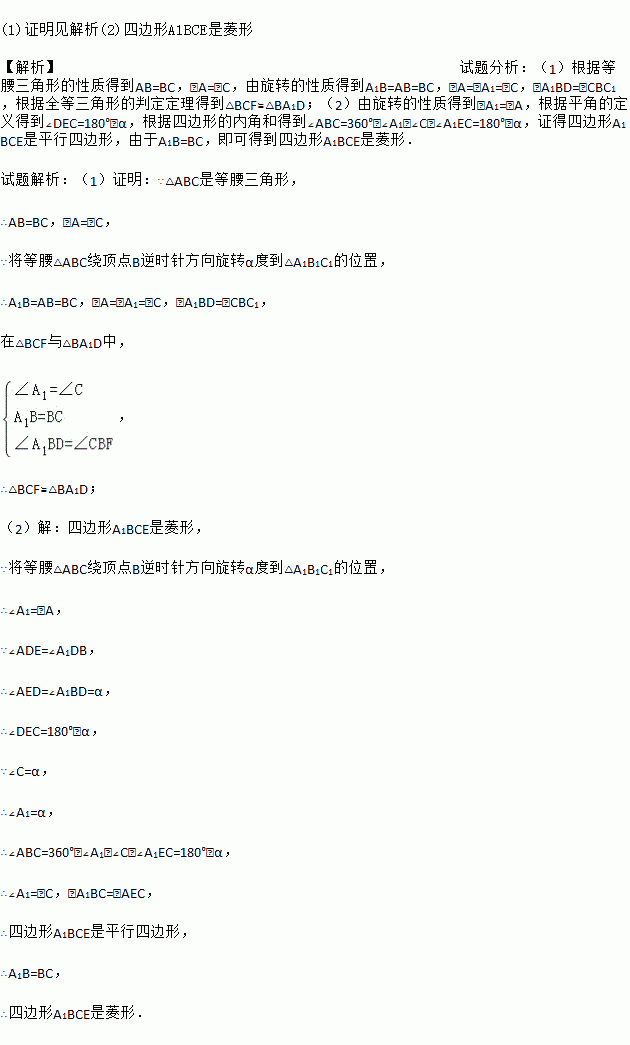 (1)证明见解析(2)四边形A1BCE是菱形 【解析】试题分析:(1)根据等腰三角形的性质得到AB=BC,∠A=∠C,由旋转的性质得到A1B=AB=BC,∠A=∠A1=∠C,∠A1BD=∠CBC1,根据全等三角形的判定定理得到△BCF≌△BA1D;(2)由旋转的性质得到∠A1=∠A,根据平角的定义得到∠DEC=180°﹣α,根据四边形的内角和得到∠ABC=360°﹣∠A1﹣∠C﹣∠A1EC=...