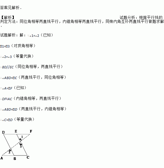 已知:如图,∠1=∠2,∠A=∠F,试说明∠C=∠D.