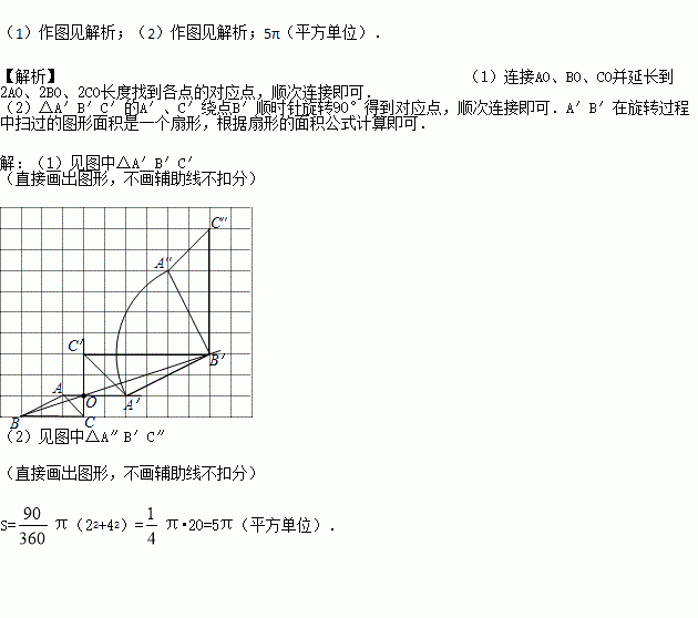 (1)以点O为位似中心,在方格图中将△ABC放大为原来的2倍,得到△A′B′C′;
