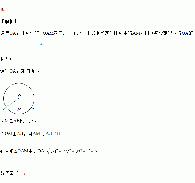 如图,⊙O的弦AB=8,M是AB的中点,且OM=3,则⊙O的半径等于_____.