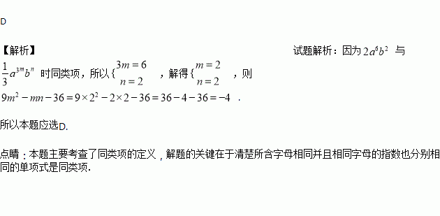 已知2a6b2和a3mbn是同类项,则代数式9m2-mn-36的值为( )