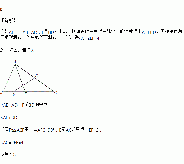如图,在△ABC中,D是BC上一点,AB=AD,E,F分别是AC,BD的中点,EF=2,则AC的长是( )