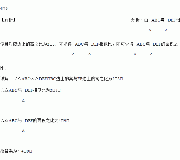 已知△ABC~△DEF, BC边上的高与EF边上的高之比为2:3,则△ABC与△DEF的面积的比为_________________.