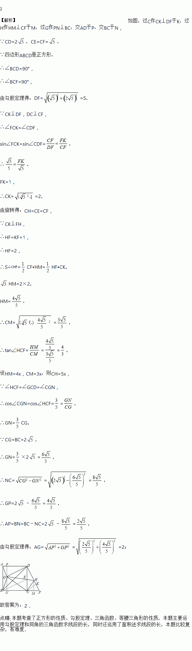 的正方形ABCD中,点E是CD边的中点,延长BC至点F,使得CF=CE,连接BE,DF,将△BEC绕点C按顺时针方向旋转,当点E恰好落在DF上的点H处时,连接AG,DG,BG,则AG的长是_____.
