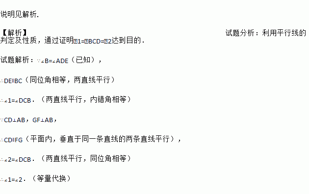 如图,CD⊥AB,GF⊥AB,∠B=∠ADE,试说明∠1=∠2.