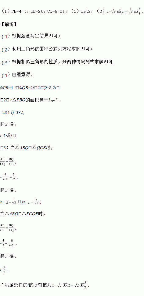 (3) (如图2),若E为边CD中点,连结EQ、AQ.当以A、B、Q为顶点的三角形与△EQC相似时,直接写出满足条件的t的所有值.