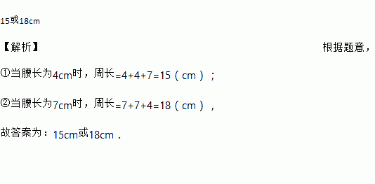 15或18cm 【解析】根据题意, ①当腰长为4cm时,周长=4+4+7=15(cm); ②当腰长为7cm时,周长=7+7+4=18(cm), 故答案为:15cm或18cm.