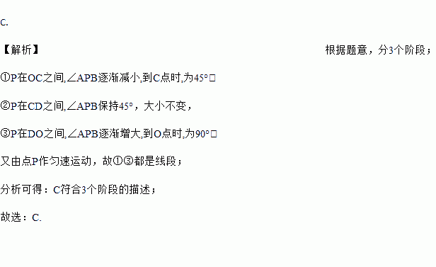 如图,AC,BD是⊙O直径,且AC⊥BD,动点P从圆心O出发,沿O→C→D→O路线作匀速运动,设运动时间为t(秒),∠APB=y(度),则下列图象中表示y与t之间的函数关系最恰当的是( )