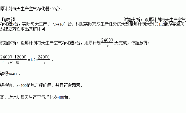 某工厂原计划生产24000台空气净化器,由于雾霾天气的影响,空气净化器的需求量呈上升趋势,生产任务的数量增加了12000台.工厂在实际生产中,提高了生产效率,每天比原计划多生产100台,实际完成生产任务的天数是原计划天数的1.2倍.求原计划每天生产多少台空气净化器.