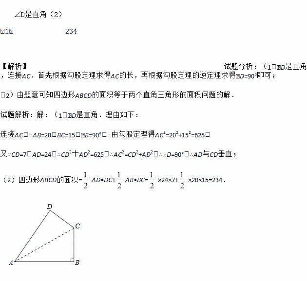 (1)∠D是直角(2)234 【解析】试题分析:(1)∠D是直角,连接AC.首先根据勾股定理求得AC的长,再根据勾股定理的逆定理求得∠D=90°即可; (2)由题意可知四边形ABCD的面积等于两个直角三角形的面积问题的解. 试题解析:【解析】 (1)∠D是直角.理由如下: 连接AC.∵AB=20,BC=15,∠B=90°,∴由勾股定理得AC2=202+152=625. ...