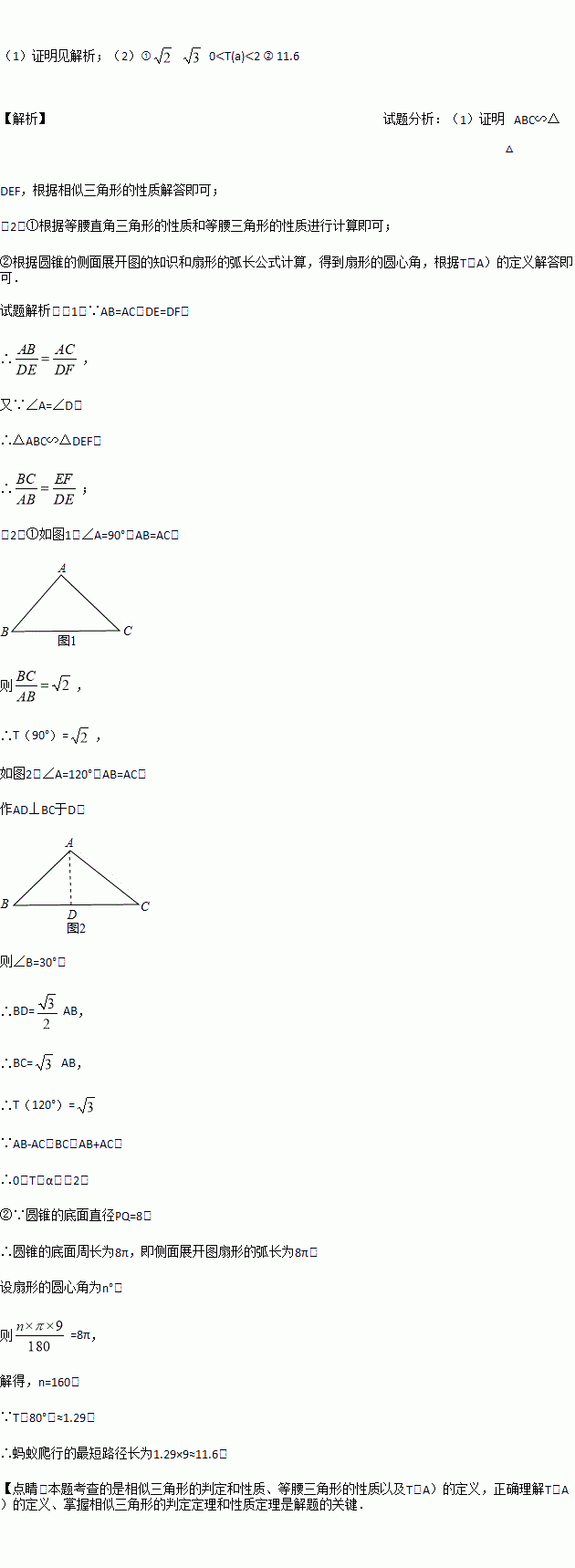 (2)由(1)中的结论可知,等腰三角形ABC中,当顶角∠A的大小确定时,它的对边(即底边BC)与邻边(即腰AB或AC)的比值也就确定,我们把这个比值记作T(A),即