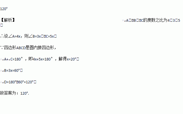 如图,在圆内接四边形ABCD中,若∠A,∠B,∠C的度数之比为4:3:5,则∠D的度数是_____°.