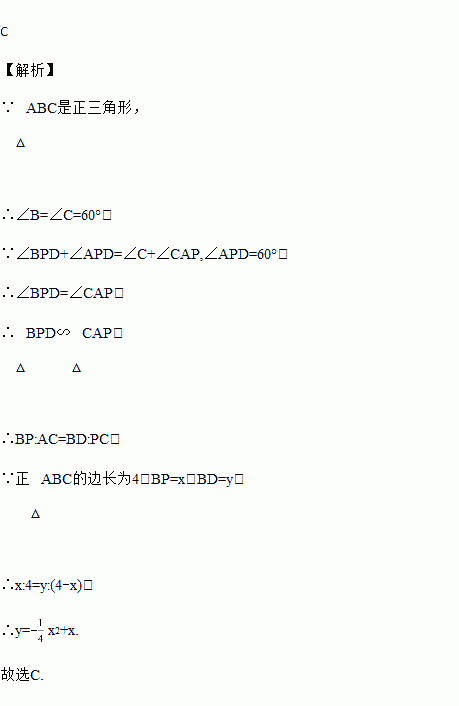 如图,正△ABC的边长为4,点P为BC边上的任意一点(不与点B、C重合),且∠APD=60°,PD交AB于点D.设BP=x,BD=y,则y关于x的函数图象大致是( )